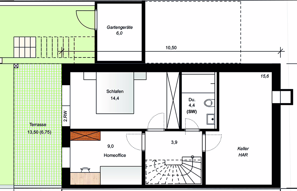 Im Gartengeschoss befindet sich ein weiteres Schlafzimmer (für die Eltern oder Kinder) und die Möglichkeit für ein weiteres Duschbad. Zusätzlich ist hier ein weiteres Zimmer für das Homeoffice oder das Gästezimmer geplant. Beide Zimmer haben einen Zugang zur Terrasse, wo Sie sich wiederum ungestört aufhalten und ebenfalls die Aussicht genießen können.